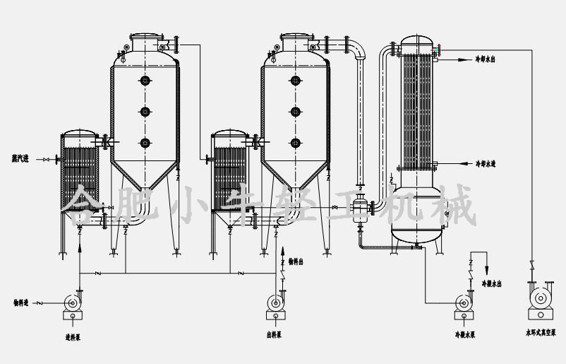 雙效外循環(huán)蒸發(fā)器(雙效濃縮器)主要由各效加熱器、各效分離器、冷凝器、冷凝液罐、真空泵、料液泵、閥門管路系統(tǒng)、電控系統(tǒng)組成。設(shè)備在運行,料液進入分離器及加熱器的管程,鍋爐蒸汽進入一效加熱器的殼程,料液在真空狀態(tài)下沸點降低,當(dāng)受熱到一定溫度后沸騰,并從噴射管噴入分離器,進行快速蒸發(fā)和汽液分離,未被蒸發(fā)的料液從底部循環(huán)管回到加熱器再噴入分離器,形成循環(huán)。由一效加熱器產(chǎn)生的二次蒸汽進入效加熱器作為加熱介質(zhì),得到熱能充分利用,從而實現(xiàn)節(jié)能效果。二效蒸發(fā)器內(nèi)的物料運動狀態(tài)與一效同理,當(dāng)料液縮到一定的程度,經(jīng)取樣確定合格后即可出料。而產(chǎn)生的二次蒸汽進入冷凝器殼程,被管程內(nèi)的冷卻循環(huán)水換熱冷凝成液,進入冷凝水收集罐,最后排出。