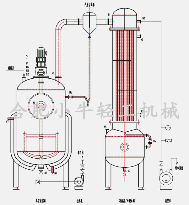 合肥小牛真空減壓濃縮器加熱形式可根據(jù)用戶工況設(shè)計為蒸汽加熱式或電加熱式,滿足無鍋爐熱源的用戶使用。真空濃縮罐設(shè)有夾套及保溫層,夾套內(nèi)通入蒸汽(蒸汽加熱式)或?qū)嵊停娂訜崾剑┻M行加熱,從而給濃縮罐內(nèi)物料間接傳熱,耐高溫保溫層能有效隔熱保溫,減少能耗,有效避免操作人員燙傷事故發(fā)生。罐體配有視鏡視燈,能夠隨時觀察罐內(nèi)狀態(tài)。生產(chǎn)完成后,利用CIP自動旋轉(zhuǎn)清洗球能夠?qū)迌?nèi)進行360度沖洗。特殊定制的攪拌裝置有效地避免了料液因濃度過高而出現(xiàn)的粘壁現(xiàn)象,攪拌裝置采用優(yōu)質(zhì)機械密封,確保不會因高真空而出現(xiàn)漏氣現(xiàn)象。真空濃縮罐內(nèi)物料受熱而產(chǎn)生的蒸汽中帶有有效成份的泡沫在汽液分離器中被分離出來通過管道回流至罐內(nèi),其余二次蒸汽通過列管式換熱器被冷凝成液體,進入冷凝水收集罐,最后排出或回收利用,不凝性氣體隨真空泵一起排出。該設(shè)備可進行負壓或常壓操作,也可以進行連續(xù)或間歇生產(chǎn)。